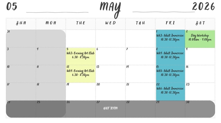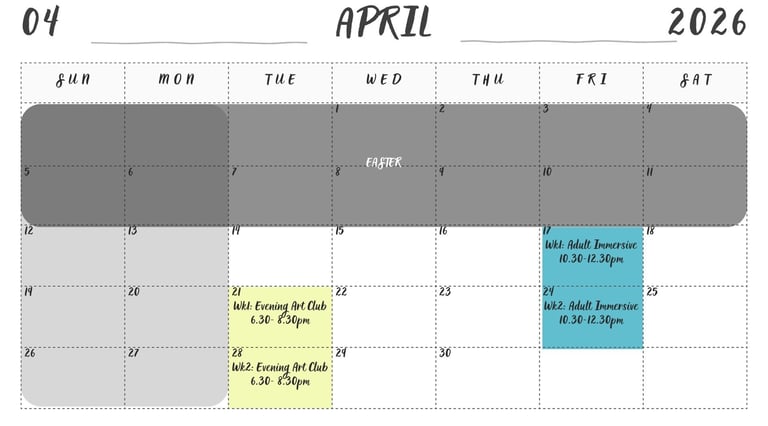 Our Adult Creative Courses are a welcoming space to explore new techniques and grow your artistic confidence. Each course focuses on a particular method or style, with guided projects that introduce inspiring artists from past and present. You’ll learn practical skills while enjoying the freedom to experiment, interpret ideas in your own way, and develop a personal style. Every course ends with a unique final piece that reflects your creativity, giving you the tools and confidence to continue your practice independently.