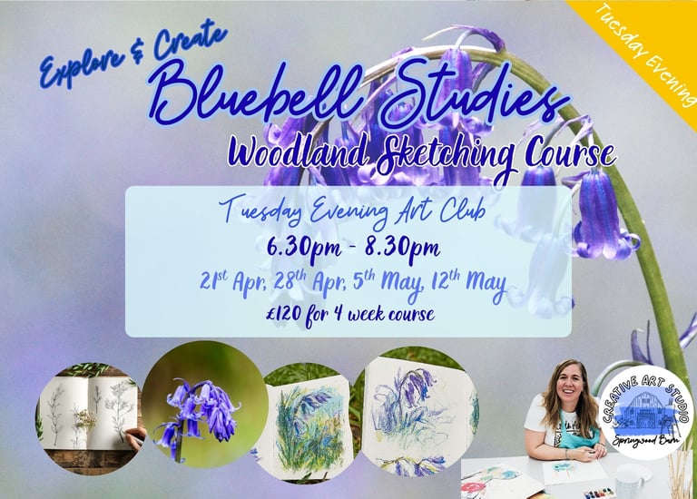 During this course we will explore the lines, shapes, and gentle movement found in English bluebells. Using the bluebell wood beside the studio, you’ll have the opportunity to walk through the woodland and sketch en plein air (outdoors), embracing the colour and form of a semi‑ancient habitat. Weather permitting, we will venture outside each week to sketch or photograph different elements of the woodland, returning to the studio to develop your work and build in more detail. We will use a range of linear materials including pencil, pen, and pastel. This evening course is very similar to the daytime course but is shorter in length.