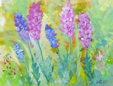 My studio sits beside a semi‑ancient woodland, and each spring the bluebells transform it. Vibrant purples rise against deep greens and earthy browns, creating a carpet of colour so intense it feels almost unreal. Their bloom is brief but powerful, remembered long after it fades.