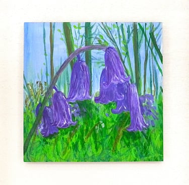 This series of four explores the shifting viewpoints and depths from which these bluebells can be seen when walking through the woods. Painted directly onto wood panels, the work completes a quiet circle, using nature itself as both subject and surface, allowing art and woodland to speak to one another.